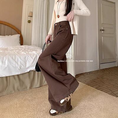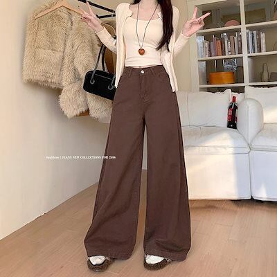 アメリカンレトロコーヒーカラーワイドレッグジーンズレディースハイウエストルーズスリムオールマッチストレートパンツ