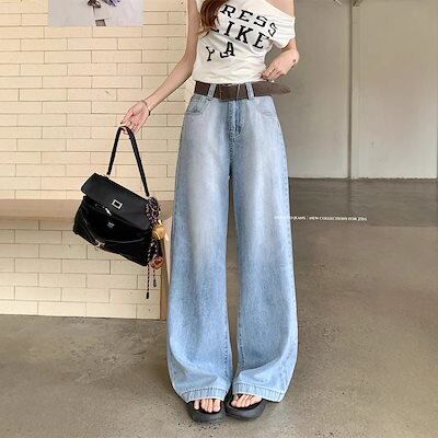 春のハイウエストでスリムなゆったりとしたストレートフロアレングスのパンツのレディース用アメリカンレトロライトカラーワイドレッグジーンズ