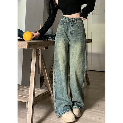 アメリカンレトロハイストリートダメージジーンズレディース春ハイウエストスリムワイドレッグパンツストレートパンツフロアレングスパンツトレンディ