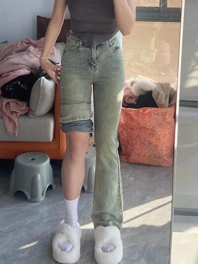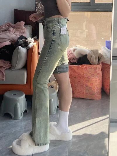 レトロレトロレトロなマイクロフレアジーンズ女性春春の新型ビッグサイズ太mmハイウエストスリム梨型ボディパンツデニムボトムス 2025 レディース