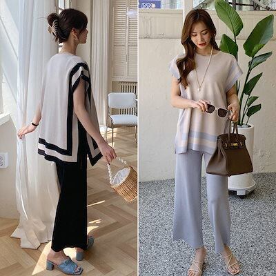 夏の日本風新配色ストライプスプリットトップススリムワイドレッグ9点パンツニットツーピーススーツレディース