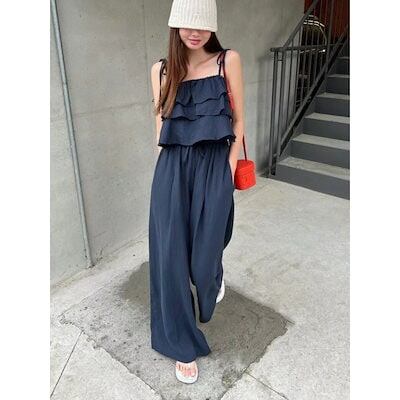 夏の日本風新韓国風年齢を感じさせないフリルサスペンダートップシャツハイウエストスリムワイドレッグパンツツーピーススーツレディース