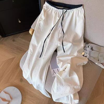黒と白の配色ドローストリング伸縮性ウエスト細身カジュアルパンツ2025レディース夏新作ハイウエストストレートチューブスリムワイドレッグパンツ