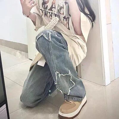 デニムパンツ 星 ワッペン バギーパンツ ワイドパンツ レディース デニム かわいい 貼り付け デザイン カジュアル ロングパンツ 大きいサイズ かっこいい