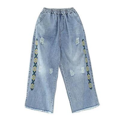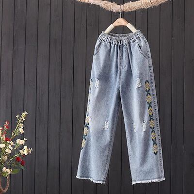 ジーンズ バギーパンツ ワイドパンツ 春 夏 秋 ダメージ ウォッシュ アンクル丈 刺繍 デニムパンツ レディース