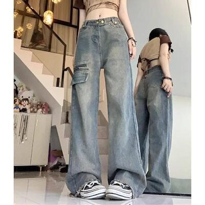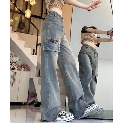 デニムパンツ ワイドパンツ フェイク ポケット ミリタリー バギー レディース 韓国ファッション カットオフ ヒップホップ ダンス ワンポイント
