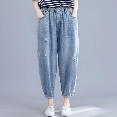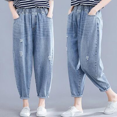 【急速出荷!】デニムパンツ レディース ジーパン ダメージ 9分丈 ウエストゴム ボトムス ワイドパンツ サルエルパンツ ゆったり 薄手 カジュアル ロールアップ