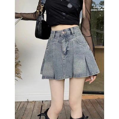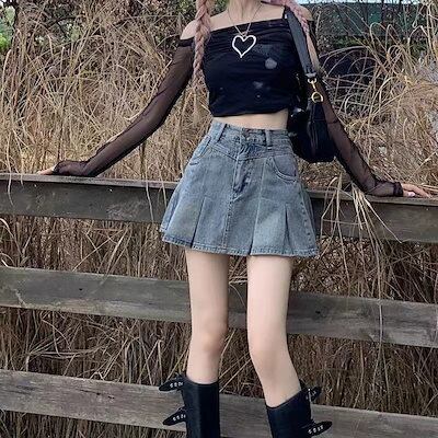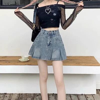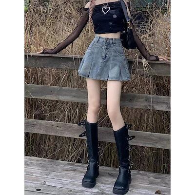 韓国ファッション 夏新作 デニムプリーツスカート レディース ハイウエスト 薄手