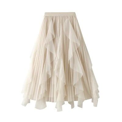 韓国ファッション マキシスカートタイトスカートプリーツスカート2022春春夏新作ハイウエストフリルスプラインチュールプリーツスカートレディースミディアムロング裾プリーツスカート脚魅せミニスカート脚魅せ