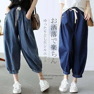 デニムパンツ サルエルパンツ レディース ワイドパンツ ボトムス 夏 ワイド バルーンパンツ 9分丈 パンツ デニム タック入り ロングパンツ 体型カバー ロングパンツ 総ゴム ズボン ワイドパンツ