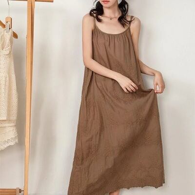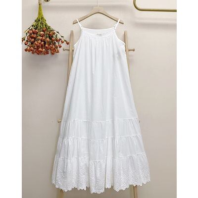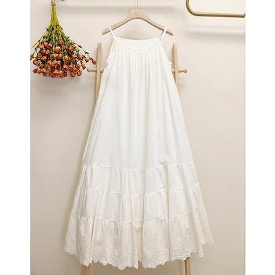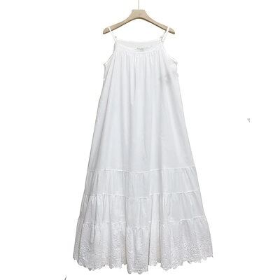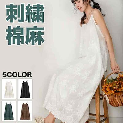春夏 棉麻 ワンピース 森ガールスタイル レディース コットンワンピース カジュアル ストラップ付き 刺繍 無地 ロングスカート ルーズウエスト サスペンダー付き大人用 織りホームローブ