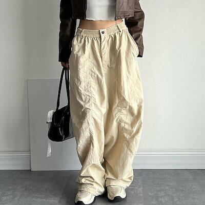 2025春夏 ウエストゴム ハイウエストカーゴパンツ ボトムスワイドパンツベイカーパンツストレートゆったりルーズ 韓国カジュアルスポーティーメンズライクレディースファッショントラック