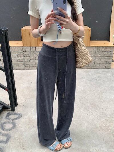2025春夏 パンツロング丈 ハイウエストゆったりストレートモップパンツウエストゴム 脚長効果美脚効果細見え春カジュアル 黒白韓国系ファッションレディースサイドお出かけおしゃれ かわいい衣装トラック