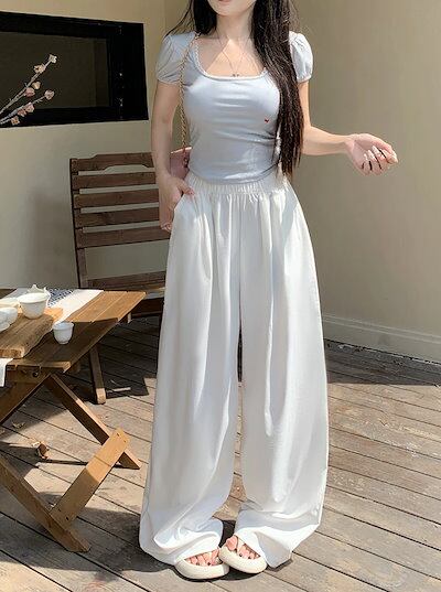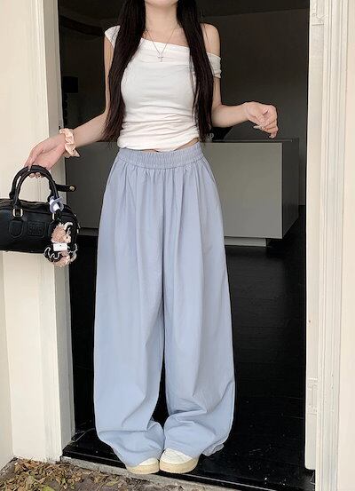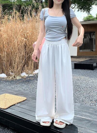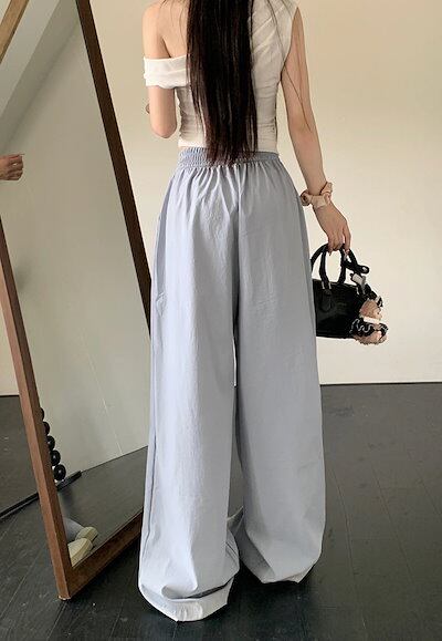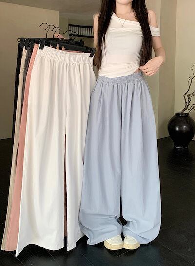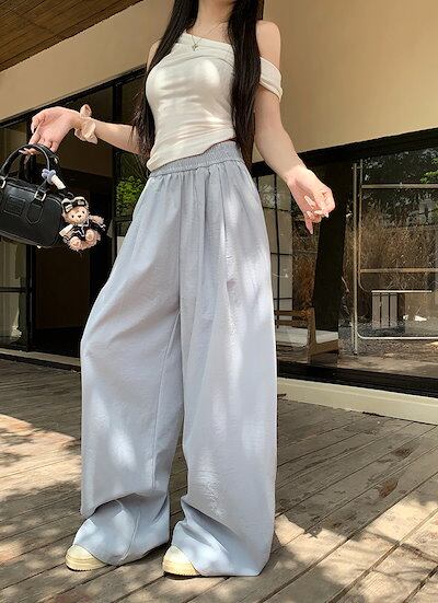 2025春夏 パンツロング丈 ハイウエストゆったりストレートモップパンツウエストゴム 脚長効果美脚効果細見え春カジュアル 韓国系ファッションレディースサイドお出かけおしゃれ かわいい衣装トラック