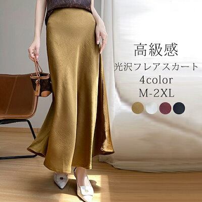 フレア スカート ロング マキシスカートレディース 膝下 ロングスカート ウエストゴム 体型カバー ハイウエスト フレアスカート ゆったり 高見え 光沢 高級感 薄手 コーデ 大人 Aラ