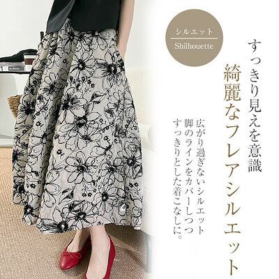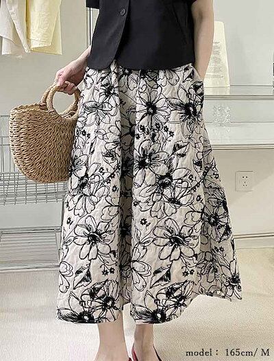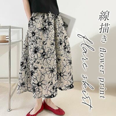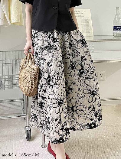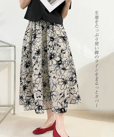 スカート レディース ボトムス ハイウエスト ウエストゴム フラワースカート ロング丈 ミモレ丈 春 夏 花柄 フラワー 花柄スカート 総柄 裏地 Aラインスカート 上品 お呼ばれ マ