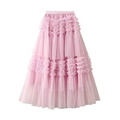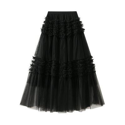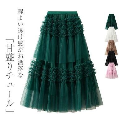 スカート レディース ボトムス チュールスカート 秋 冬 春 夏 無地 ロングスカート ボリューム ロング丈 aライン フレア 裏地 重ね着 シースルー ウエストゴム シアー カジ
