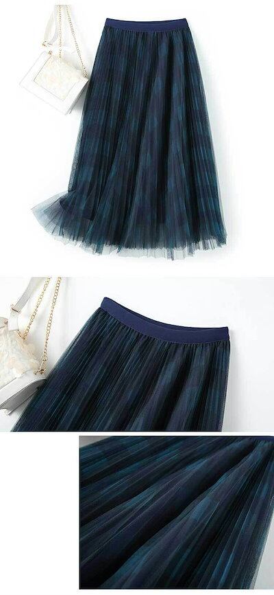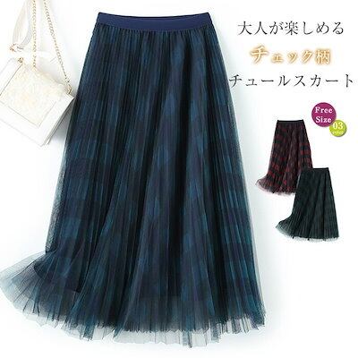 チュールスカート チェック柄 スカート プリーツスカート 春 秋 チュール レディース ハイウェスト 高見え ウエストゴム ロングスカート ボトムス 体型カバー カジュアル 可愛い おしゃれ