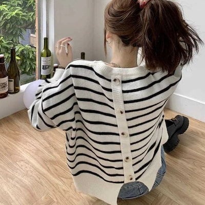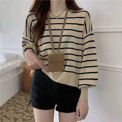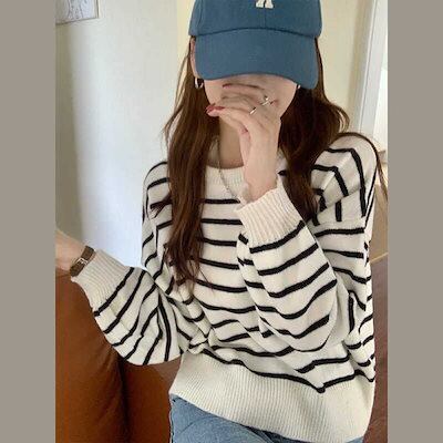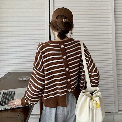 人気なリブニット 秋冬 ニットトップス イレギュラー背中スリットデザイン ストライプ ニットセーター レディース 韓国ファッション ゆったり セーター 百掛け 着痩せベーシックニット