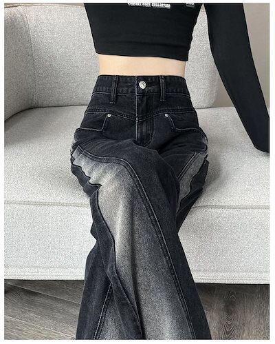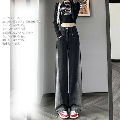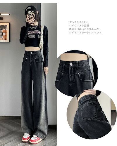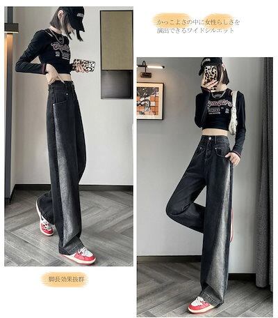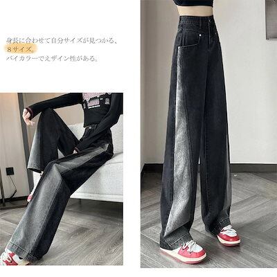 ワイドパンツ デニム レディース フレアパンツ パンツ ジーパン ボトムス デニムパンツ 切り替え バイカラー ゆったり ストレートパンツ ハイウエスト 着痩せ デザイン性 オシャレ 着回し カジュア
