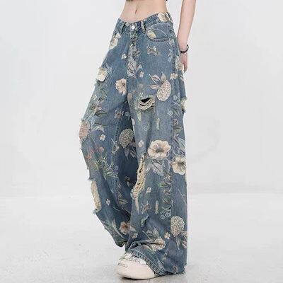 花卉プリントの穴が開いたジーンズ女性夏の新型の薄い腰がゆったりしているズボン