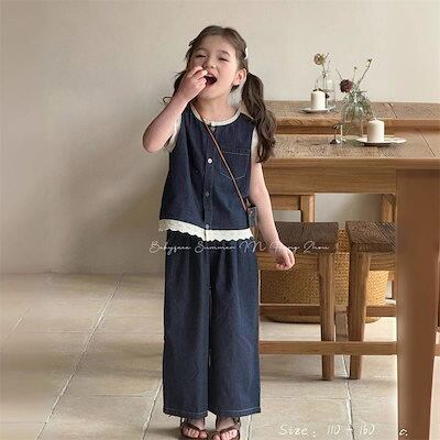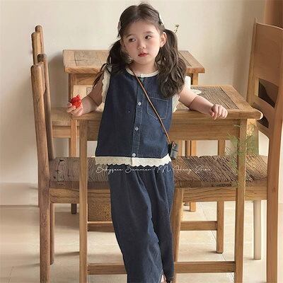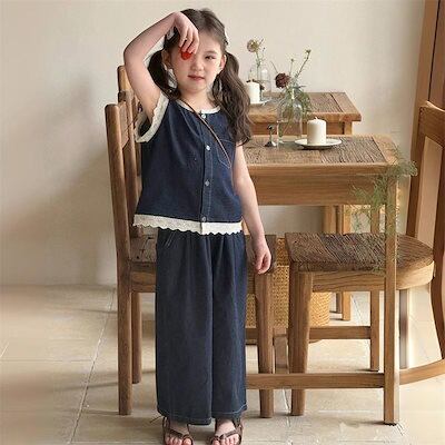 夏服上着無地 韓ファッション レディースゆったり部屋着 Tシャツ女の子の夏のスーツの子供ののデニムの広い足のズボンのレースの袖なしのベストのつのセットトブラスニーカーメガ割