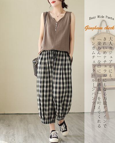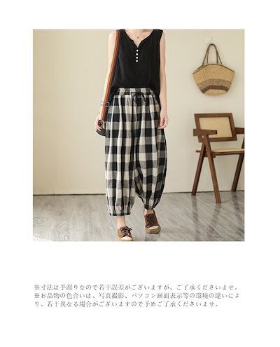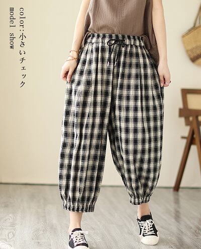 薄手 ゆったり 春夏 九分丈 アンクルパンツ 部屋着 リネン チェック レディース イージーパンツ テーパード ウェスト紐 チェックパンツ パンツ 可愛い ギンガムチェック 総ゴム ポケットサルエルパ