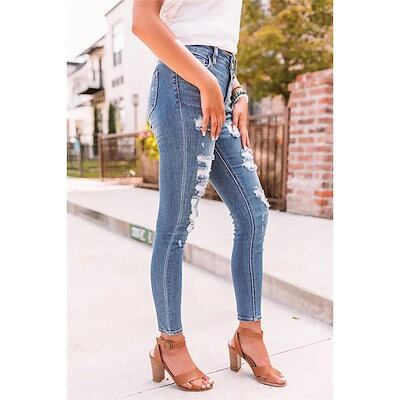 【幸運】デニムパンツ レディース スキニー ボトムス ダメージ ジーンズ ストレッチ 着痩せ アンクル丈 美脚 カジュアル スリム 新着 伸縮 動きやすい