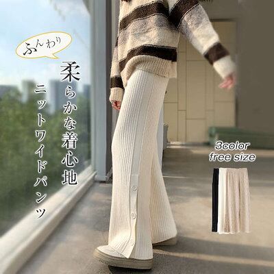 【メガ割 】ハイウエスト フレア パンツ ワイドパンツ フレアパンツ ワイド 無地 レディース ゴム ボトムス サイドスリット ニットパンツ ワンマイルウェア きれいめ ガウチョパンツ リブニット ゆ