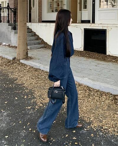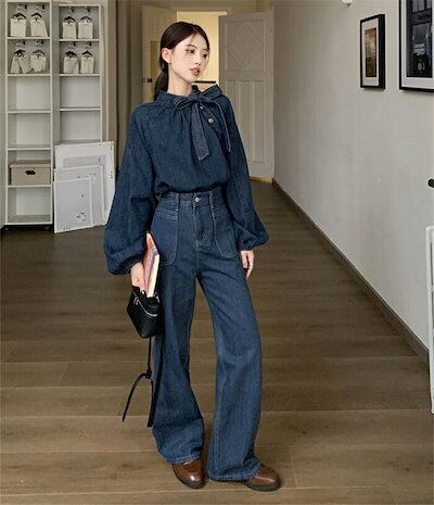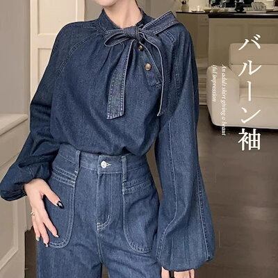 ボウタイブラウス デニム ボウタイ ブラウス レディース 長袖 プルオーバー トップス プチハイネック シャツブラウス バルーン袖 ボリュームスリーブ デニムブラウス 斜めボタン 春秋 春 長袖ブラウ