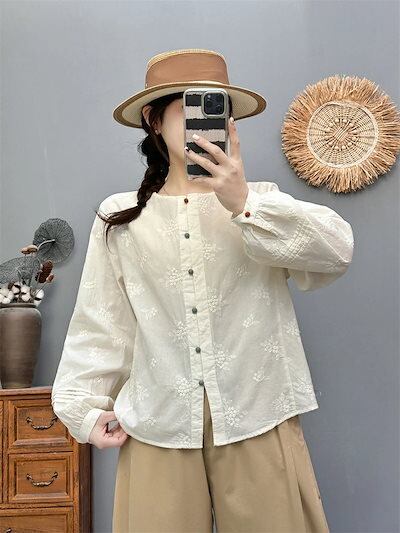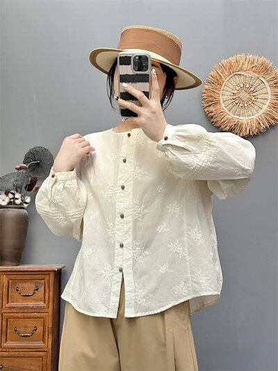 長袖 ブラウス トップス 刺繍 シャツ レディース チュニック 春 長袖ブラウス 長袖トップス 綿 春 配色 コットン シャツブラウス 前開き ボタン留め 夏 刺繍ブラウス ゆったり 体型カバー 通気