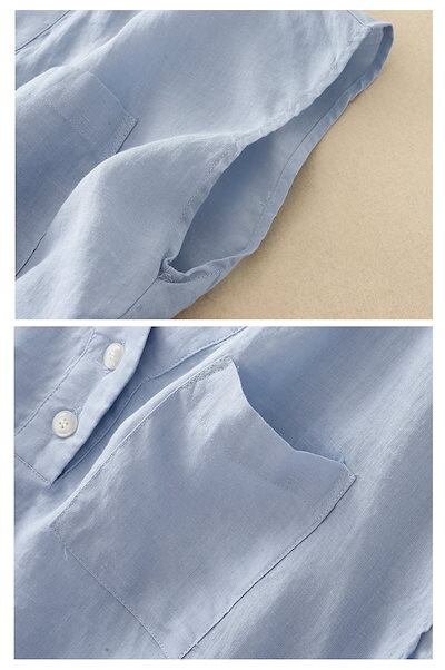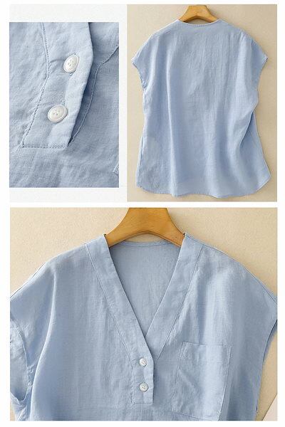 シャツブラウス シャツ 綿麻風 ブラウス レディース 夏 ノースリーブ プルオーバー Vネック 夏シャツ ボタン 白シャツ 無地 トップス 白 ブルー 袖なし ポケット 体型カバー 涼しい 薄手 リネ