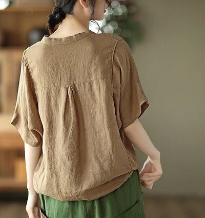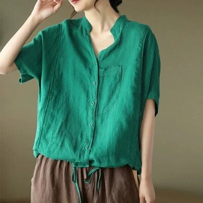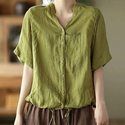 半袖シャツ シャツ ブラウス レディース 半袖ブラウス 白シャツ Vネック 半袖 春夏 前開き ボタン 立ち襟 ポケット付き 無地 シャツブラウス 裾紐付き 大きいサイズ ゆったり トップス 体型カバ