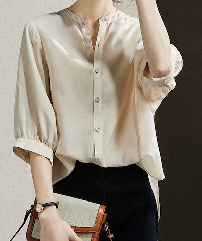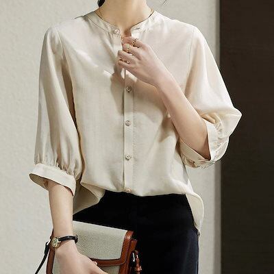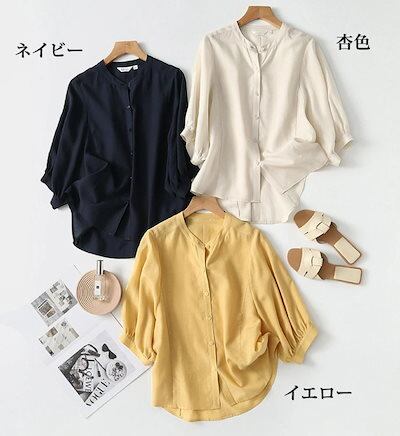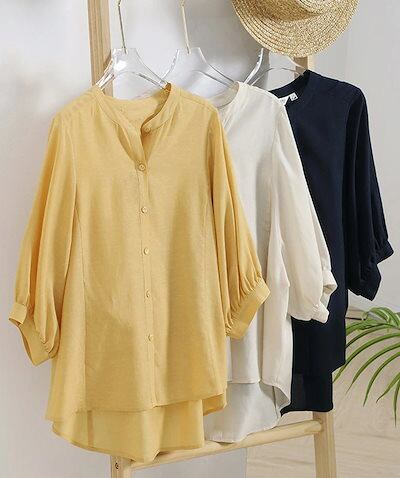シャツ ブラウス レディース バンドカラーシャツ 七分袖 シャツブラウス 春夏 夏ブラウス バルーン袖 前開き ボタン トップス 大きいサイズ シフォンシャツ 七分袖ブラウス 無地 前後差 通気性 爽