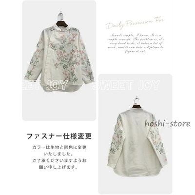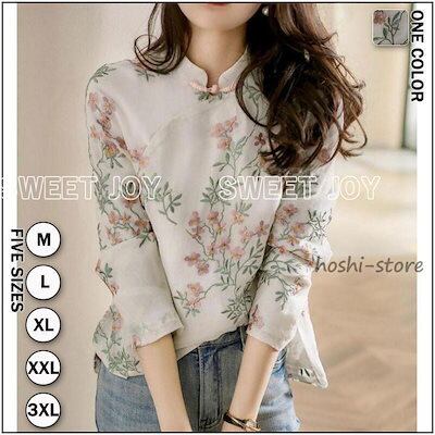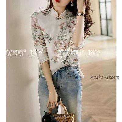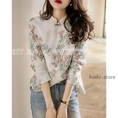 新作ブラウス チャイナ風 レディース 長袖 リネンブラウス 綿麻混 花柄 刺繍 シャツ スタンドカラー プルオーバー チャイナボタン ゆったり ナチュラル 春 夏 秋