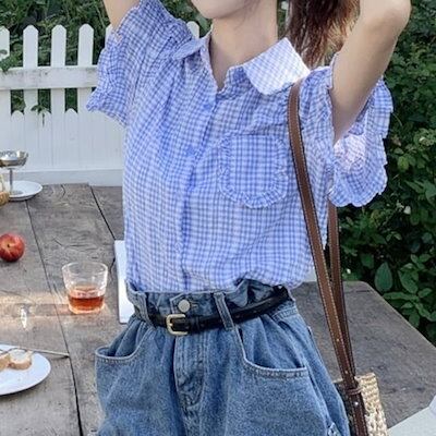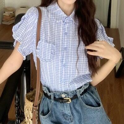 2024春夏トップスシャツ半袖ボタン襟スタンドカラーゆったりギンガムチェック柄夏青かわいいおしゃれガーリー甘めカジュアル韓国ファッションレディースお出かけ