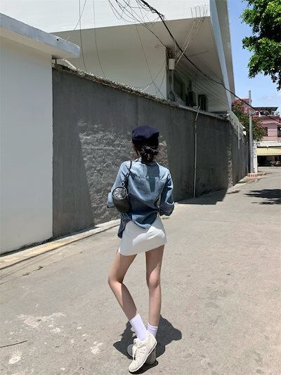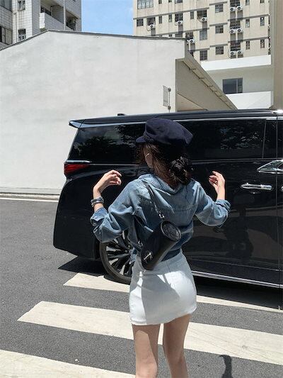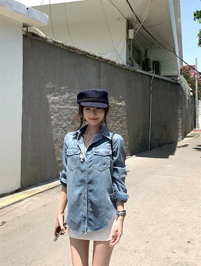2024秋冬トップスシャツデニム生地ポケット襟スタンダードカラーボタン長袖秋青ブルーおしゃれかわいい韓国ファッションレディースお出かけ