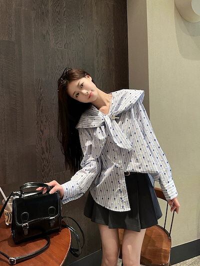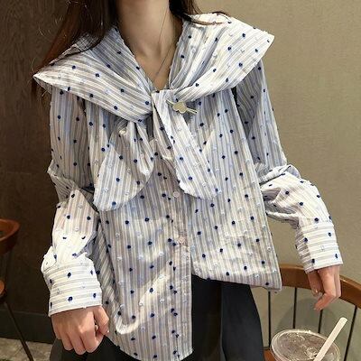 2024秋冬トップスシャツ長袖ストライプボタン襟ピューリタンカラーセーラー襟リボン秋青ブルーおしゃれかわいい韓国ファッションレディースお出かけ