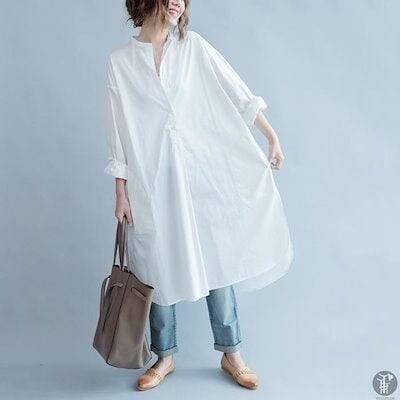 シャツ ロングシャツ フレア レディース トップス チュニック 人気沸騰 長袖 綿麻混 コットン リネン Aライン 無地 ボタン付き 白 ホワイト 大きめ