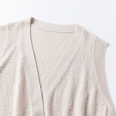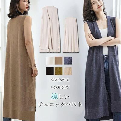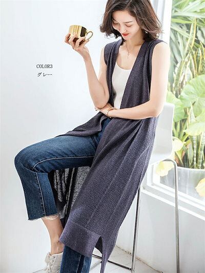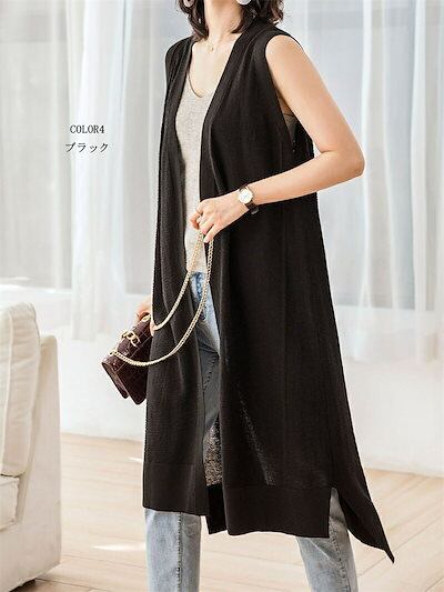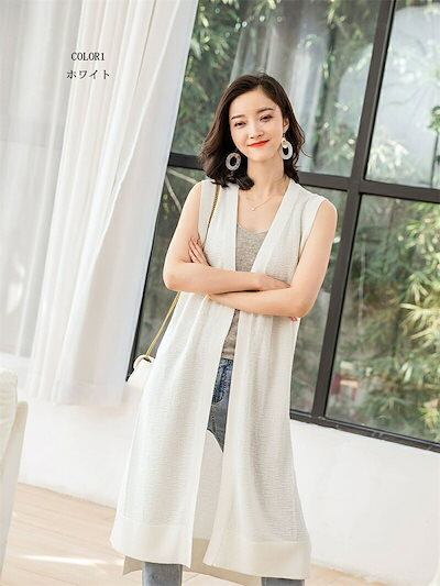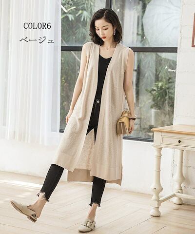 【2点購入25O円OFF】春夏 ベスト レディース 前開き ロングジレ ロング ノーボタン ノースリーブ サマーニット 羽織り ライトアウター ジレ 無地 ノーカラー チュニック スリット トップス