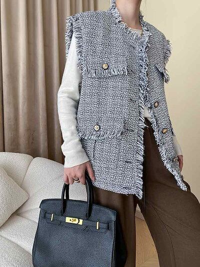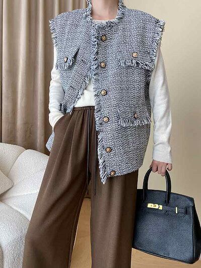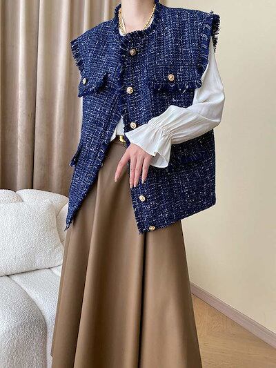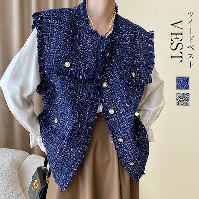 【2点購入25O円OFF】ツイードベスト ベスト ツイード レディース 秋冬 トップス オーバーサイズ ゆったり 金ボタン 金釦 羽織り カーディガン カーデ ジレ ノースリーブ レイヤード 前開き