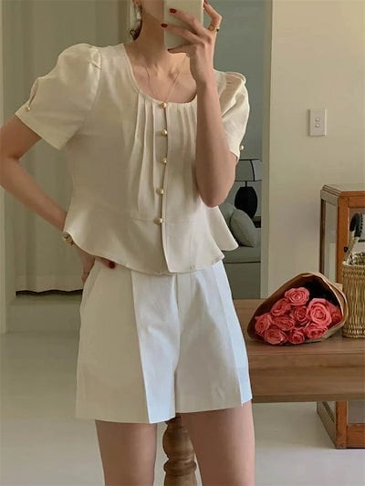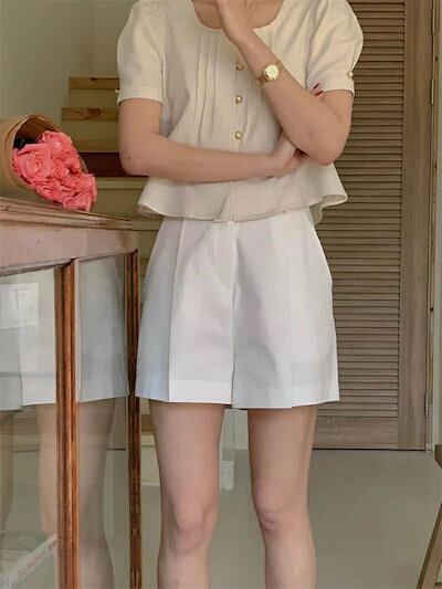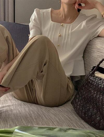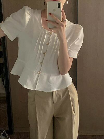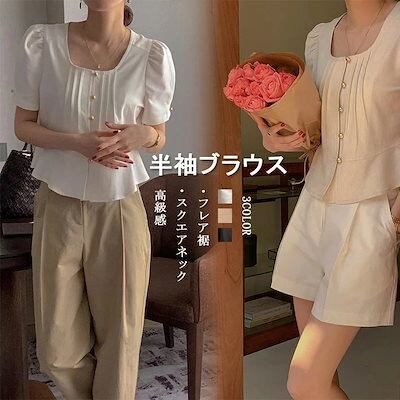 ブラウス 半袖 レディース 半袖ブラウス 無地 夏 トップス カットソー フレア スクエアネック ブラウス シャツ 柔らか 体型カバー ボタン留め タック入り 可愛い 高級感 薄手 大人可愛い 20代