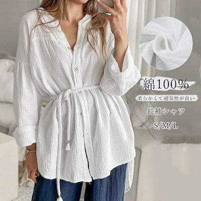 シャツブラウス 長袖 シャツ ブラウス レディース 羽織り 長袖トップス 綿100% コットン チュニック トップス 無地 白シャツ 綿シャツ 長袖ブラウス 立ち襟 春 ボタン留め 前開き ゆったり