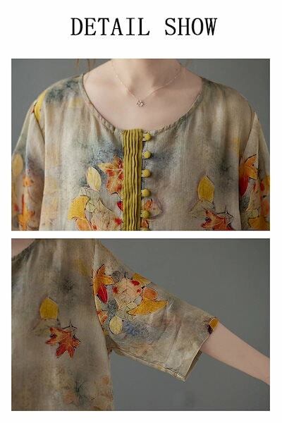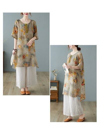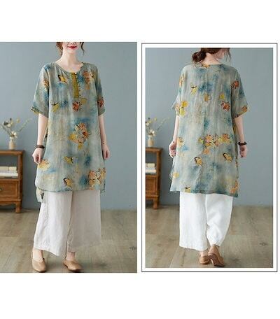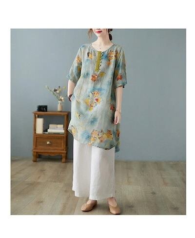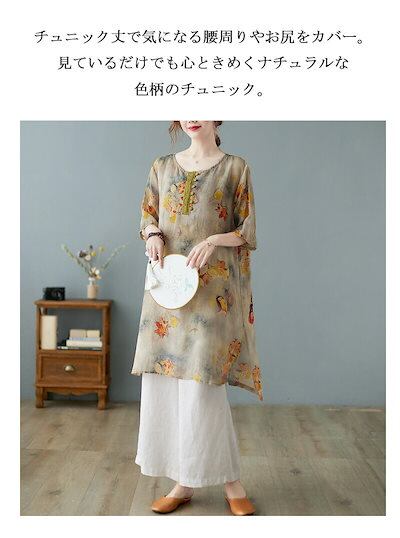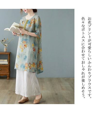 花柄 ブラウス 半袖 チュニック レディース 春夏 綿麻風 シャツ ロング丈 プリント ラウンドネック ボタン 前後差 スリット シャツブラウス 大きいサイズ ゆったり トップス 体型カバー 涼しい