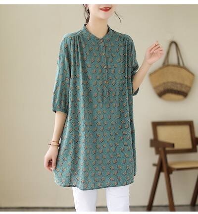 チュニック 花柄 ブラウス 半袖 レディース シャツ ロング丈 タック ギャザー シャツブラウス パフスリーブ スタンドカラー ボタン ゴム 綿麻風 トップス ゆったり 大きいサイズ 無地 きれいめ