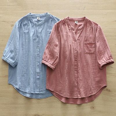 半袖シャツ 綿 ブラウス シャツ 半袖 キーネック レディース トップス シャツブラウス ガーゼシャツ 2重ガーゼ 綿シャツ 白シャツ 夏 春 半袖ブラウス ギャザー入り ボタン 前開き カジュアル