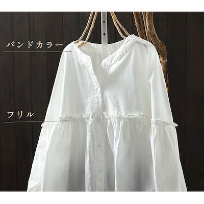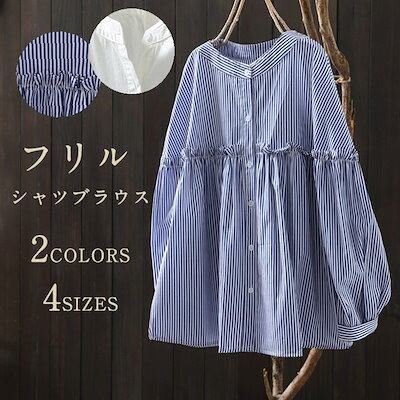 ストライプ シャツ 長袖 レディース きれいめ フリル 綿 コットン 羽織る 羽織れる トップス バンドカラー シャツブラウス ボタン 前開き ワイシャツ 柄 ギャザー 体型カバー ゆったり ライトア