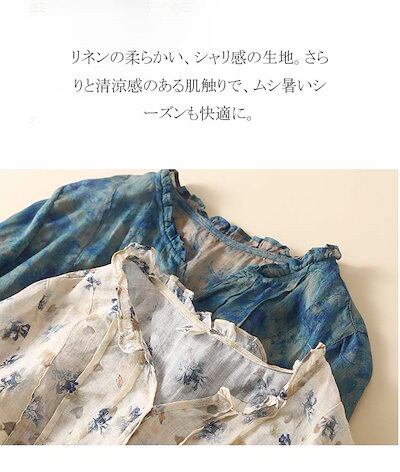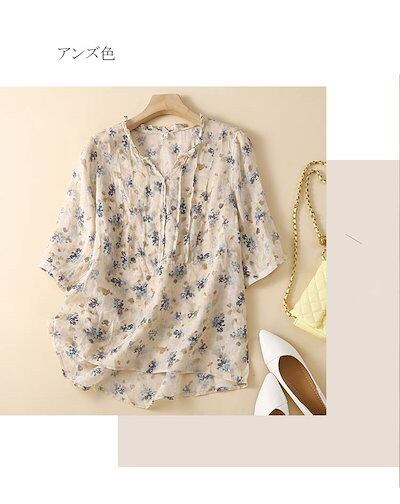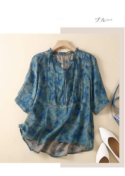 リネン シャツ ブラウス 半袖 レディース シャツブラウス 大きいサイズ Vネック 五分袖 フリル 夏ブラウス 麻100% タック入り ボタン プルオーバー ゆったり ふんわり 薄手 トップス 花柄
