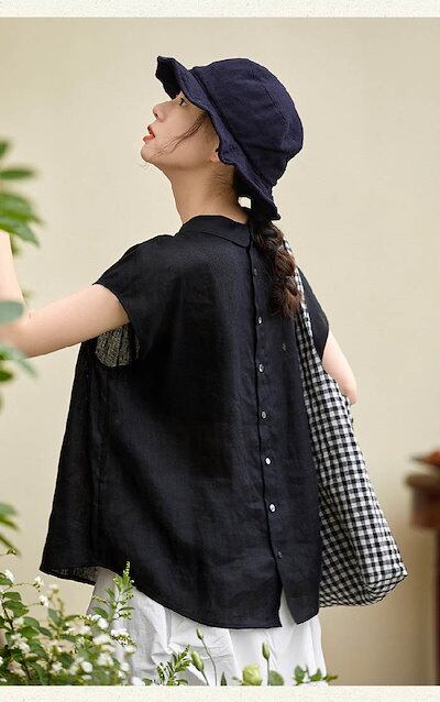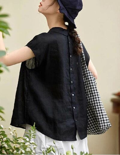 シャツ ブラウス レディース リネン コットン 半袖 春 夏 秋 シャツ バックボタン 丸襟 トップス 綿麻 無地 ナチュラル フェミニン 着回し シンプル おしゃれ 大人 カジュアル こなれ感 体