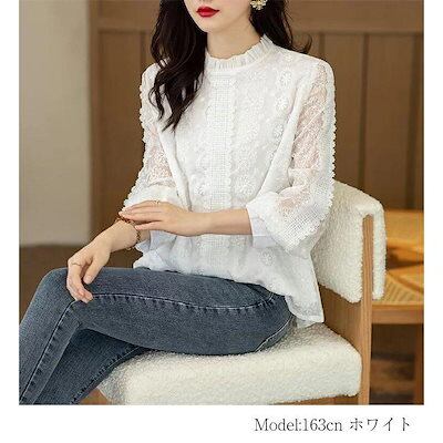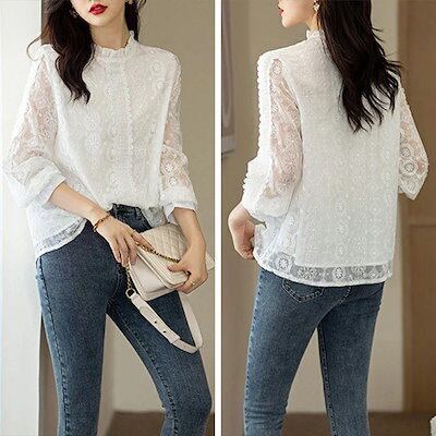 秋の新作 タイムセール 刺繍レース ブラウス レディース 春 秋 冬 長袖 フリルネック フリルブラウス トップス バックボタンデザイン 花柄 刺繍 総レース 立ち襟 透け感 カジュアル 通 2枚購入